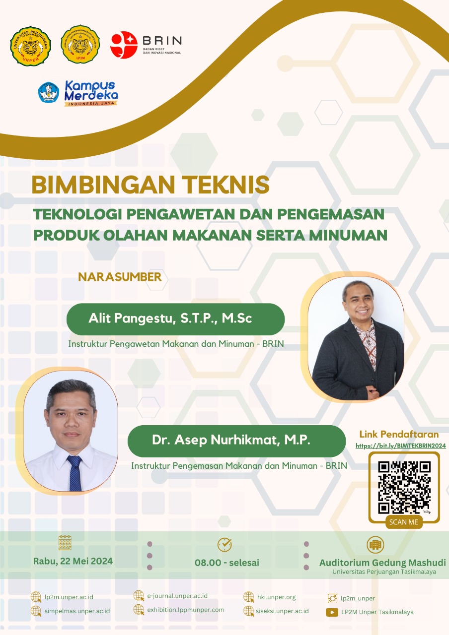 Dalam rangka membekali mahasiswa dan dosen dalam kegiatan pengabdian kepada masyarakat di lingkungan UMKM, maka Lembaga Penelitian dan Pengabdian kepada Masyarakat Universitas Perjuangan Tasikmalaya bekerjasama dengan Badan Riset Inovasi Nasional (BRIN) akan melaksanakan bimbingan teknis mengenai Teknologi Pengawetan dan Pengemasan Produk Olahan Makanan dan Minuman.