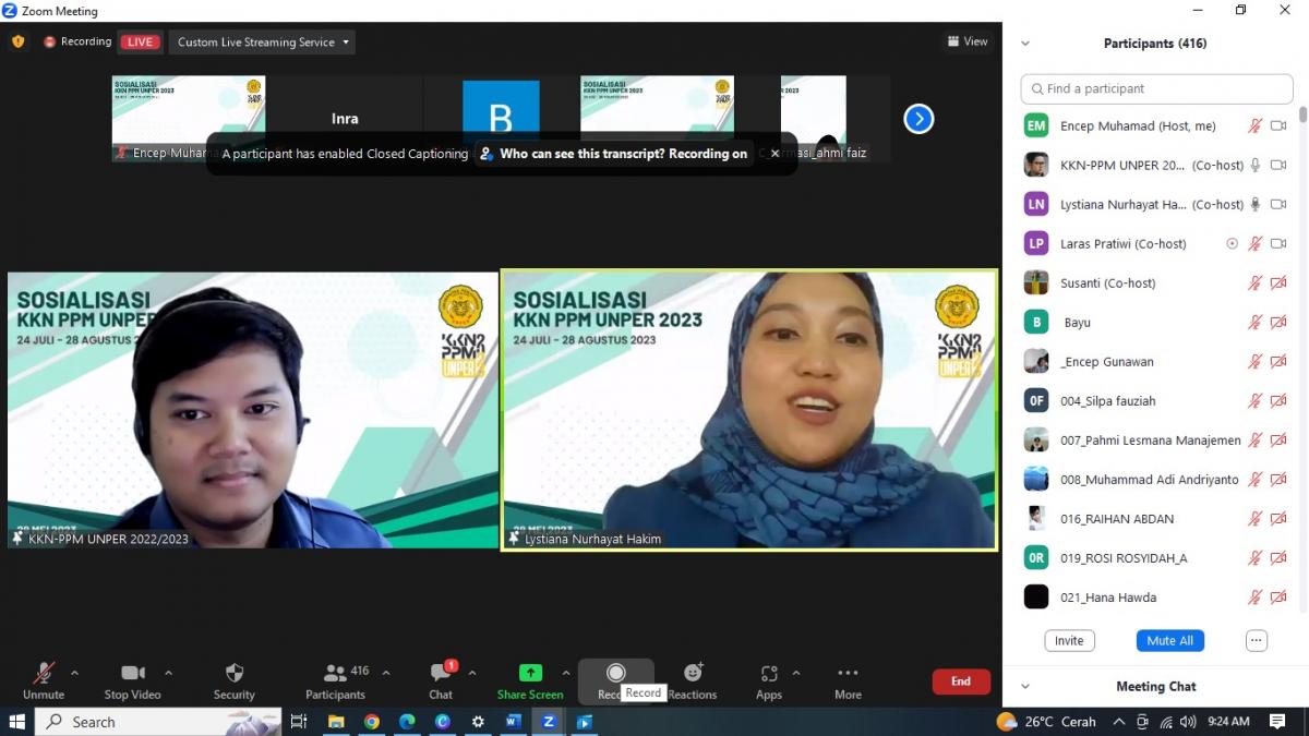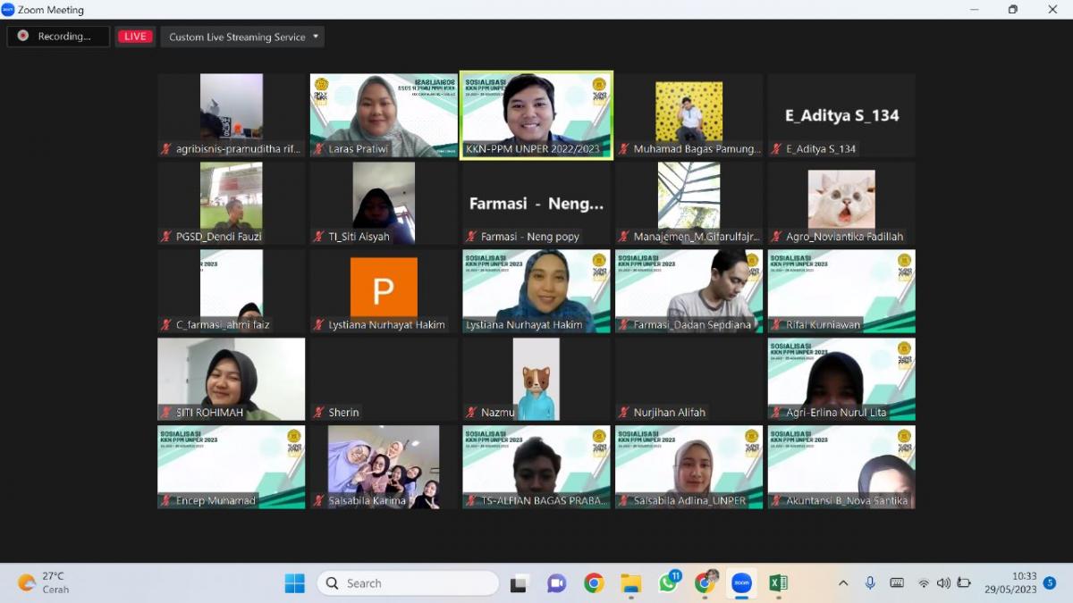 Sosialisasi Kuliah Kerja Nyata (KKN) - PPM Tahun 2023 dilaksanakan pada Senin 29 Mei 2023 Pukul 09.00 s.d. Selesai secara Daring melalui Zoom. adapun bukti kegiatan dimaksud terlampir.